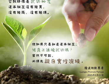 隆波闡述這簡短的觀心三項原則,它就好像是武功秘笈,這本秘笈沒有幾頁、沒有幾張、沒有幾項。但如果只是知道這本秘笈,能真正通曉武功嗎?當然不可能,必須先親自實修演練。